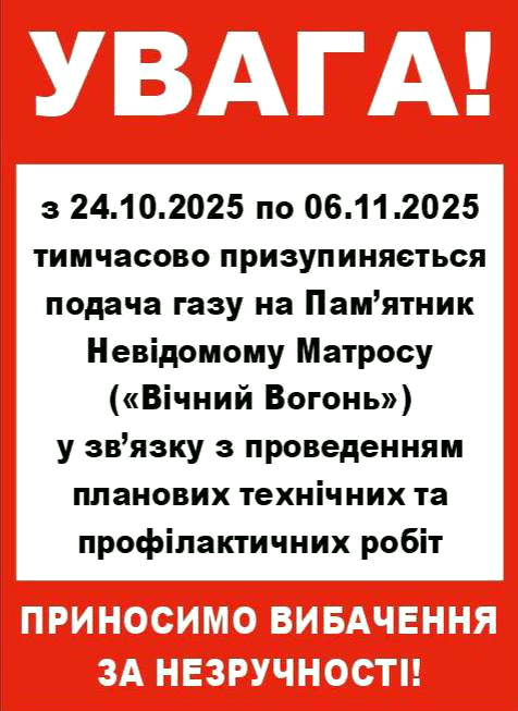 З 24 жовтня до 6 листопада в Одесі відбудеться призупинення постачання газу до меморіалу Невідомому матросу, відомому також як «Вічний вогонь». Це пов'язано з плановими технічними роботами на об'єкті, який є важливою частиною міської пам'яті.